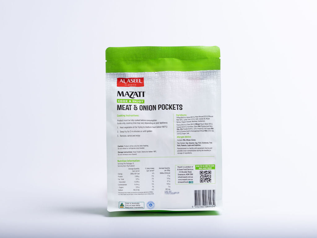Filling: Beef Mince 20.7%, Lamb 2.3%, Onion, Canola Oil,  Ghee (Milk), Mixed Spices [Cardamom, Cinnamon, Nutmeg, Black Pepper, Sweet Pepper, White Pepper], Salt, White Pepper. Pastry: Wheat(Gluten) Flour, Water, Milk, Salt, Sugar, Vegetable Oil [Cottonseed Oil, Sunflower Oil and/or Canola Oil, Antioxidant (320), Antifoam (900a)].